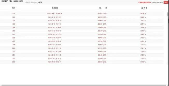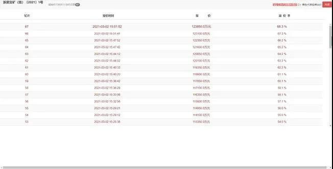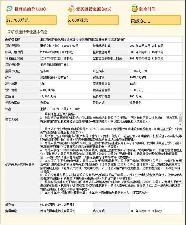 3月3日,浙江省公共資源交易中心掛牌出讓浙江省桐廬縣鳳川街道三鑫村竹桐塢礦地綜合開發利用建筑石料礦采礦權,經過303輪競價,德清縣銀華通物流有限公司以6.91億元拍得此礦權。起拍價1.77億元,溢價率290.4%。礦區建筑用石料(凝灰巖)礦控制資源量566.34萬立方米(1478.15萬噸),平均拍得資源單價12.2元/立方米。
