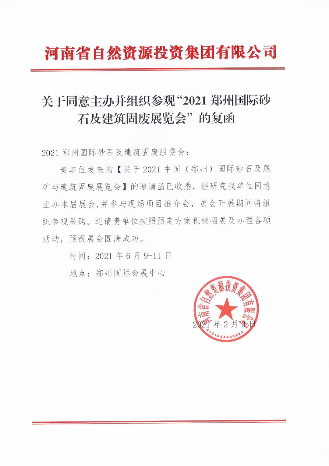 鄭州砂石展組委會目前極力整合行業資源,大力邀請行業協會、業內專家、知名學者等共同參與,塑造展會在行業的巨大影響力和代表性。為使展會更具市場影響力,組委會相繼走訪了浙江、陜西、甘肅、河南等砂石骨料大省,調研了浙江交投、陜煤新材、甘肅建投、河南自然資源集團等地方大型國企對砂石骨料行業未來發展的布局與規劃,并邀請眾多大型礦業公司和工程建設單位到會參觀和采購,致力于打造國內砂石骨料、建筑固廢再利用行業集設備銷售、技術交流、協作發展的綜合性商業平臺。2021中國(鄭州)國際砂石及尾礦與建筑固廢處理技術展覽會組委會于春節前收到了河南省自然資源集團有限公司的復函,正式成為本屆展覽會的主辦單位之一,并組織現場參觀采購!組委會對河南省自然資源集團有限公司表示衷心的感謝;相信在河南省自然資源集團有限公司的大力支持下,本屆展會將更具行業代表性,為眾多的行業知名設備廠家提供更好的產品展示和銷售窗口。