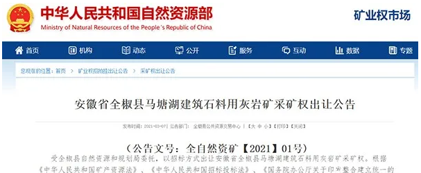 日前,全椒縣公共資源交易中心發布《安徽省全椒縣馬塘湖建筑石料用灰巖礦采礦權出讓公告》,將以招標方式出讓該礦權。