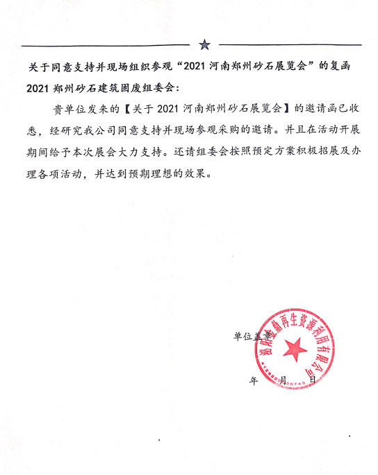 近日,泌陽金鼎再生資源利用有限公司正式回函給2021鄭州砂石展組委會,明確表示支持2021中國(鄭州)國際砂石及尾礦與建筑固廢處理技術展覽會的舉辦,將與組委會攜手共同打造中西部砂石行業盛會。在此,組委會感謝泌陽金鼎再生資源利用有限公司對展會的大力支持,也歡迎更多的企業報名參觀!