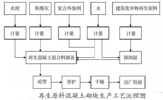 廢舊砼的中等程度的利用方式是將其制作成再生性的砌塊。將廢舊砼打碎、篩選、沖洗、干燥處置后,生產(chǎn)成為再生性的骨料,將其同水泥、砂、外加劑等材料混合攪拌,加工制作成再生性砌塊。這類處理方式在國內(nèi)已經(jīng)出現(xiàn)并已經(jīng)應(yīng)用到實(shí)際施工中。再生原料混凝土砌塊生產(chǎn)工藝流程圖如圖所示。
