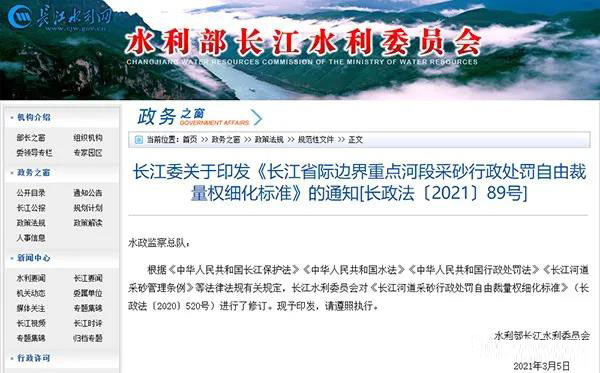 2021年3月5日,為了做好長江干流省際邊界重點河段采砂管理的現場執法,查處非法采砂行為,水利部長江水利委員會將修訂后的《長江河道采砂行政處罰自由裁量權細化標準》(長政法〔2020〕520號)予以印發。