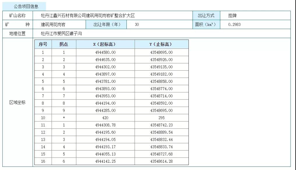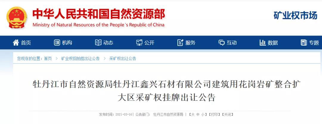 牡丹江市自然資源局牡丹江鑫興石材有限公司建筑用花崗巖礦整合擴大區采礦權掛牌出讓公告(牡采讓字[2021] 1 號)