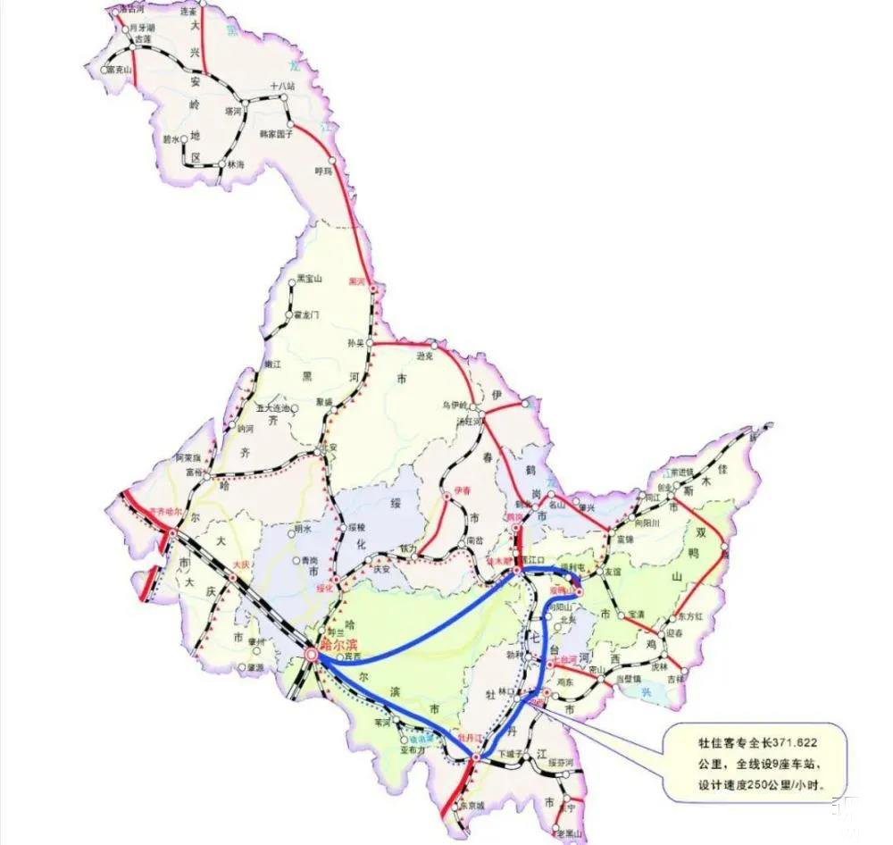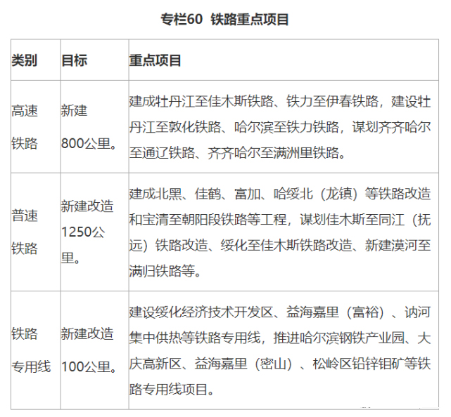1、新建高速鐵路800公里。主要包括建成牡丹江至佳木斯鐵路、鐵力至伊春鐵路,建設牡丹江至敦化鐵路、哈爾濱至鐵力鐵路,謀劃齊齊哈爾至通遼鐵路、齊齊哈爾至滿洲里鐵路。