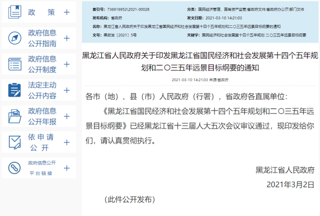 據獲悉,近日黑龍江人民政府發布關于《黑龍江省國民經濟和社會發展第十四個五年規劃和二〇三五年遠景目標綱要》的通知(以下簡稱《通知》)。