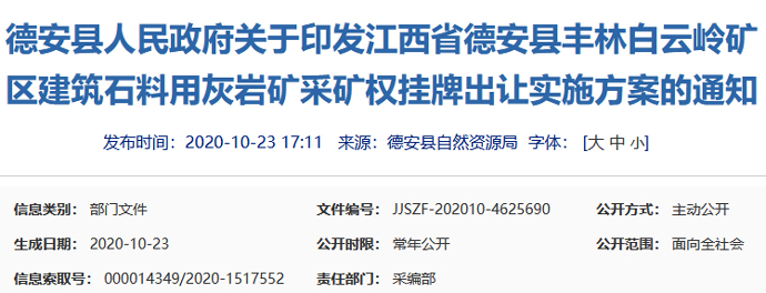 10月23日,江西省九江市得安縣人民政府公開發布《江西省德安縣豐林白云嶺礦區建筑石料用灰巖礦采礦權掛牌出讓實施方案》,標志著該礦權9月份的出讓再次以失敗告終。這已經是白云嶺礦區第三次出讓未成功。