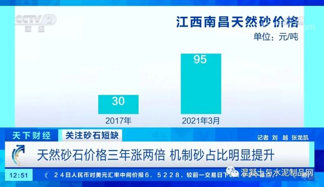 三月中旬,江西當?shù)氐奶烊簧皟r格為每噸95元,相比2017年的每噸30元,漲幅已經(jīng)超過2倍,同時因為天然砂資源分布不均,不易運輸,所以在建筑需求更大的廣東、上海地區(qū),價格漲幅就更加明顯。