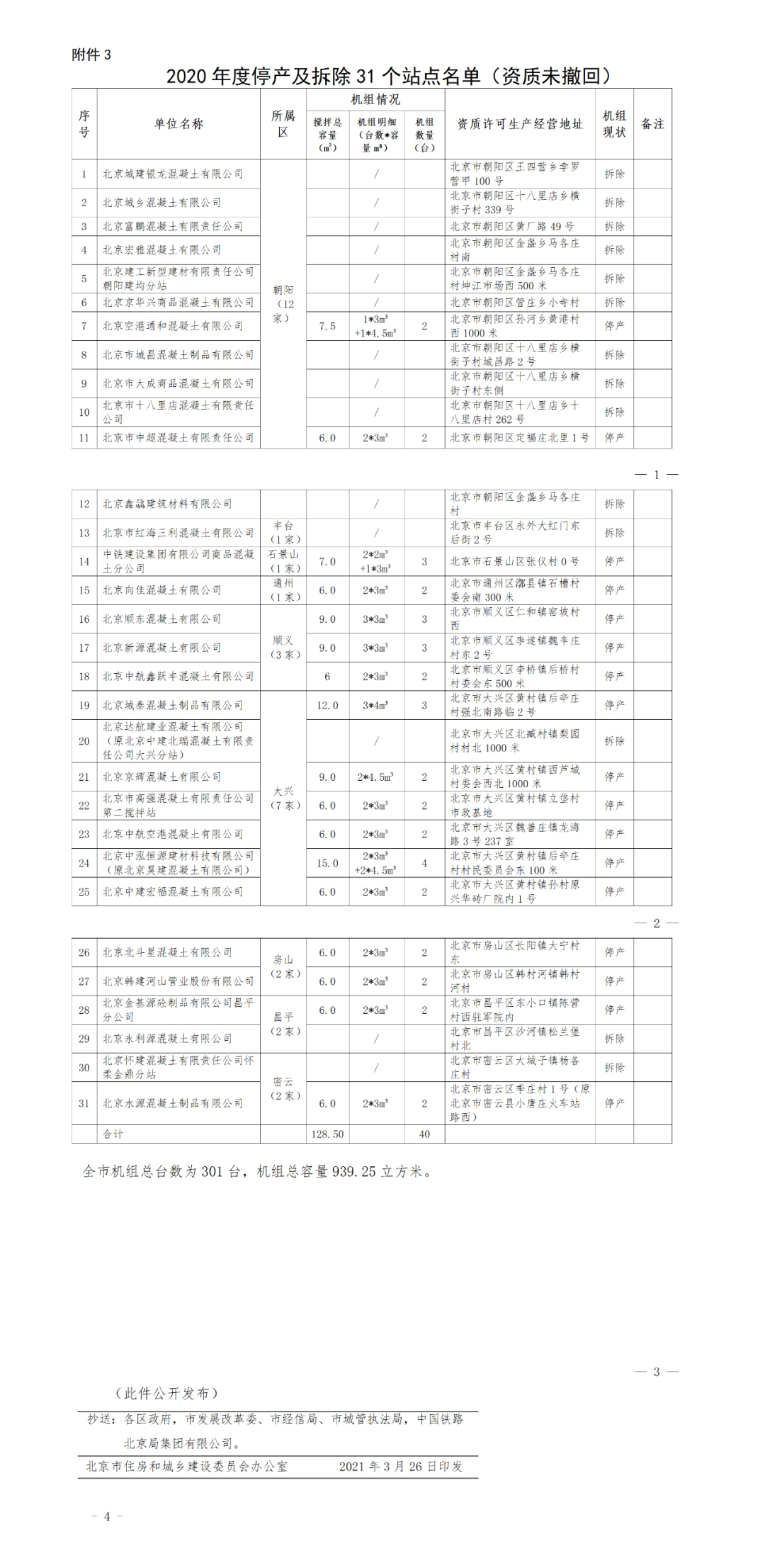 近日,北京市住房和城鄉建設委員會發布“關于2020年度《預拌混凝土綠色生產管理規程》專項執法檢查結果的通報”(以下簡稱《通報》)?!锻▓蟆凤@示,截至2020年年底,北京市有資質的混凝土攪拌站點共計131個,較2019年年底減少13個。本次檢查正常生產受檢站點100個,其中檢查結果在良好以上水平的站點90個,檢查結果低于良好水平的站點10個。北京市有資質的混凝土攪拌站點機組總臺數為301臺,機組總容量939.25立方米,比2019年有較大降幅。