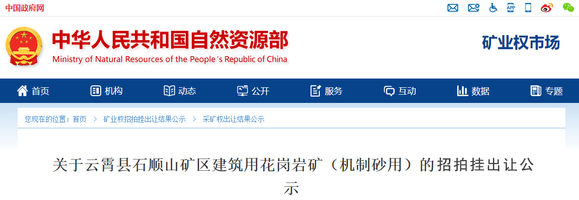 云霄縣石順山礦區建筑用花崗巖礦(機制砂用)采礦權出讓成交結果公示