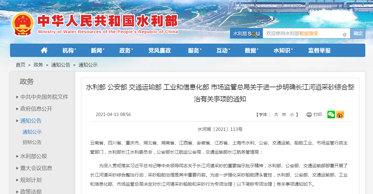 其中,通知要求,全面摸排階段將于2021年6月20日前完成,期間需完成包括全面摸排長江干流及通江支流和湖泊停泊、移動或作業的采砂船舶,全面摸排采砂船舶指定停泊情況,全面摸排本行政區域內采砂船舶建(改)造點三