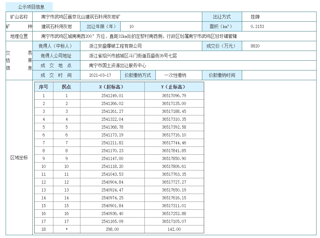 2021年03月17日,南寧市武鳴區醬京北山建筑石料用灰巖礦采礦權以掛牌方式出讓,根據《中華人民共和國礦產資源法》《中華人民共和國拍賣法》/《中華人民共和國招標投標法》《礦產資源勘查區塊登記管理辦法》/《礦產資源開采登記管理辦法》《礦業權交易規則》,以及《國務院辦公廳關于印發整合建立統一的公共資源交易平臺工作方案的通知》等相關規定,現將成交結果公示如下: