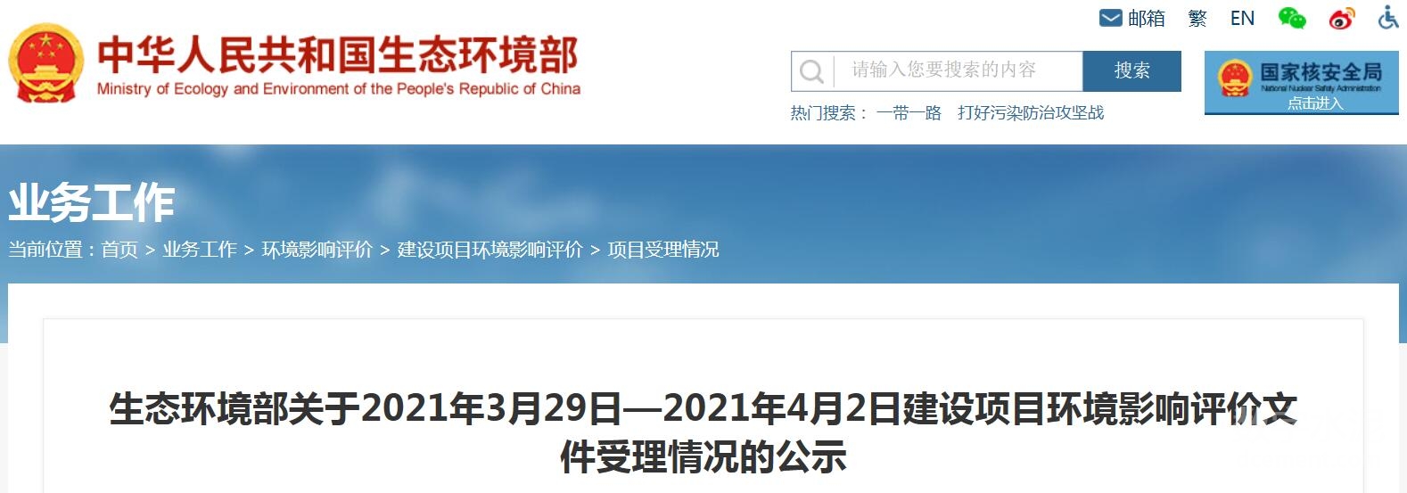 根據建設項目環境影響評價審批程序的有關規定,2021年3月29日—2021年4月2日我部共受理1個建設項目環境影響評價文件。現將受理情況予以公示,公示期為2021年4月2日—2021年4月16日(10個工作日)。