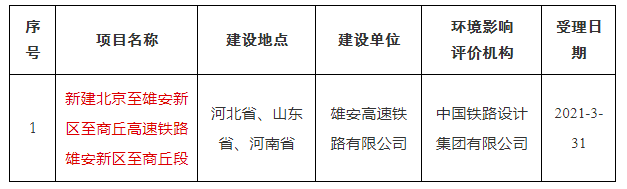 近日,生態環境部官網公示了《新建北京至雄安新區至商丘高速鐵路雄安新區至商丘段》建設項目環境影響評價文件受理情況。