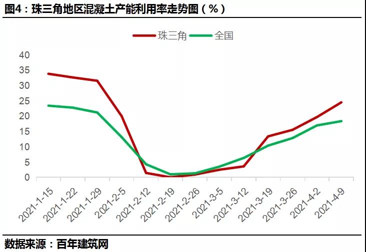 春節前期,珠三角地區平均混凝土產能利用率持續高于全國平均水平,市場需求仍表現良好,隨著春節假期工地停工放假,混凝土產能利用率明顯下降;2月10日至3月16日,廣東省下游采購需求不太樂觀,工地開工進度較慢,混凝土出貨量不佳,產能利用率也隨之偏低。截止到3月17日,珠三角地區混凝土產能利用率開始高于全國水平,這也說明混凝土行業轉折點的到來。據百年建筑網最新調研數據顯示,截至4月9日珠三角混凝土產能利用率為24.5%,高于全國平均水平6.14個百分點。珠三角地區混凝土產能利用率的提高佐證了下游攪拌站對砂石的需求的提升。