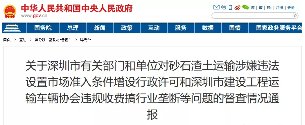 關(guān)于深圳市有關(guān)部門和單位對(duì)砂石渣土運(yùn)輸涉嫌違法設(shè)置市場(chǎng)準(zhǔn)入條件增設(shè)行政許可和深圳市建設(shè)工程運(yùn)輸車輛協(xié)會(huì)違規(guī)收費(fèi)搞行業(yè)壟斷等問題的督查情況通報(bào)