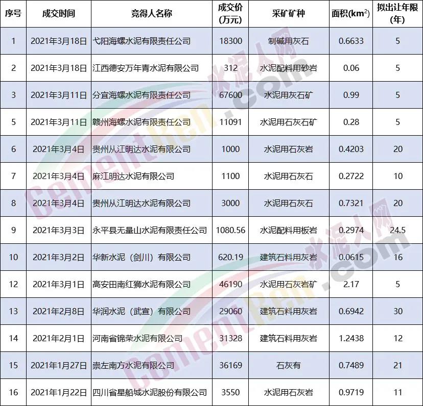 全國水泥行業礦山普查探礦權岀讓成交結果統計