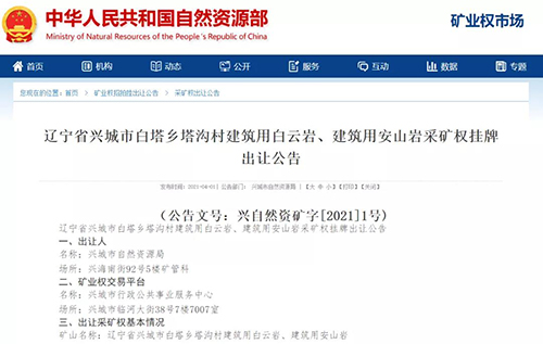 日前,興城市自然資源局發布公告,擬對遼寧省興城市白塔鄉塔溝村建筑用白云巖、建筑用安山巖采礦權進行掛牌出讓。