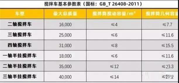 對于攪拌車的裝載限制,國家是有明確的標準。就拿我們最常見的前四后八的攪拌車來說,也就是上面表格中的四軸攪拌車,它在裝滿混凝土之后最大的總質量要小于等于31噸,攪拌筒幾何容積≤15.5m3,攪拌筒攪動容積≤8m3。