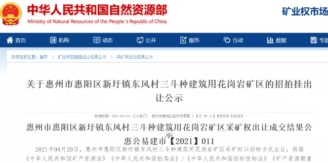 4月20日,惠州市惠陽區自然資源局發布《惠州市惠陽區新圩鎮東風村三斗種建筑用花崗巖礦區采礦權出讓成交結果公示》,惠州市交通投資集團有限公司、惠州交投公路建設有限公司、惠州交投公路發展有限公司、廣東省交通規劃設計研究院集團股份有限公司(聯合體)競得該采礦權,成交價為37940.8051萬元。