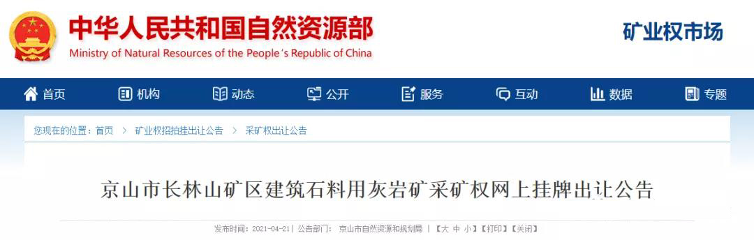 京山市長林山礦區建筑石料用灰巖礦采礦權網上掛牌出讓公告(公告文號:荊礦網掛(2021)1號)