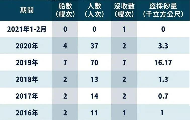 據臺媒報道,違法抽砂船盜采砂嚴重,根據“海巡”報告統計,去年一整年在澎湖南端的「臺灣灘」,驅離大陸抽、運砂船,高達3422艘。為此,“立院”去年三讀通過針對《土石采取法》、《專屬經濟海域及大陸礁層法》修正案,增加未經許可盜采海砂罰則,可處1年以上、7年以下有期徒刑,得并科新臺幣1億元以下罰金,且經判決確定,可變賣、廢棄、或將抽砂船無償留供公用。