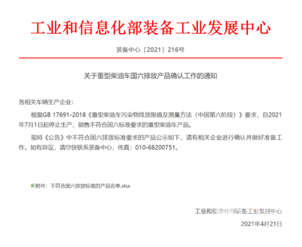 2021年4月21日,工業和信息化部裝備工業發展中心發布了《關于中型柴油車國六排放產品確認工作的通知》,根據GB 17691-2018《中型柴油車污染物排放限值及測量方法(中國第六階段)》要求,自2021年7月1日起停止生產、銷售不符合國六排放標準的重型柴油車產品。