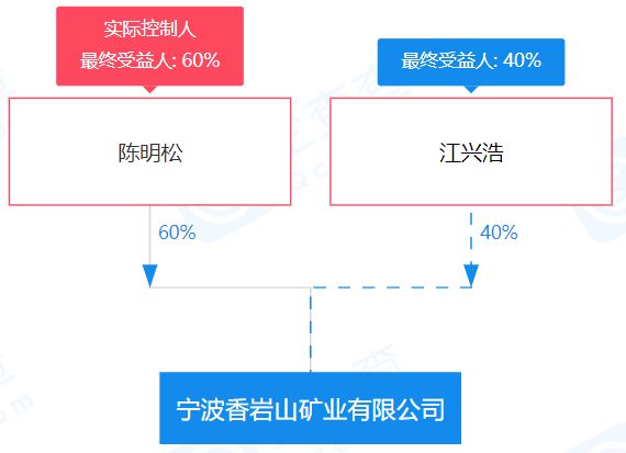 據企查查顯示,寧波香巖山礦業有限公司成立于2021年4月9日,法定代表人陳明松,注冊資本2000萬元人民幣,位于浙江省寧波市寧海縣西店鎮望海村東周1號,陳明松持股60%擔任執行董事兼總經理;江興浩持股40%擔任監事。