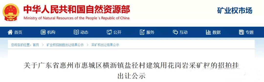 廣東省惠州市惠城區橫瀝鎮鹽徑村建筑用花崗巖采礦權采礦權出讓成交結果公示惠公易建市[2021]011號