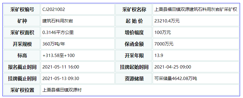 項目的競買申請人,視為對《上栗縣福田鎮雙源建筑石料用灰巖礦采礦權掛牌出讓實施方案》所有條款無異議,并對可能存在的風險完全接受。
