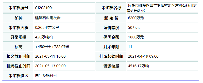 此礦權位于江西省萍鄉市新東區白竺鄉柘村,礦區面積約0.205平方千米,資源儲量4516.17萬噸,年生產規模420萬噸/年,開采年限11年,起拍價6200萬元,最終被萍鄉市八方新材料有限公司以43000萬元拍下,拍得資源單價9.5元/噸,溢價率高達593.5%。