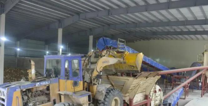 鏟車將分類好的建筑原料倒入上料口內(nèi)