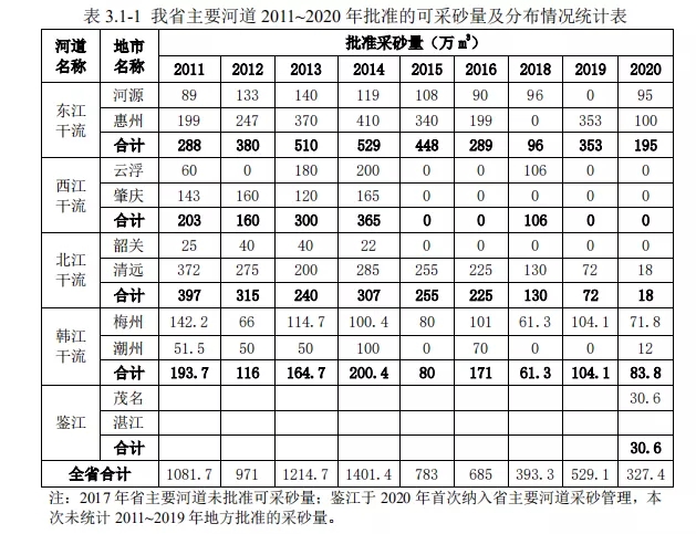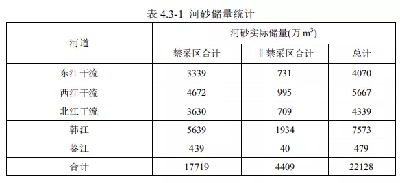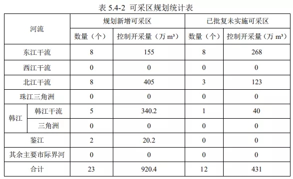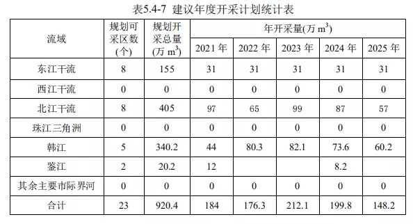 本次規劃范圍河段新增可采區23個,其中北江干流8個、東江干流8個、韓江干流5個、鑒江2個,合計控制開采量920.4萬m?;其中2021年開采量184萬m?,2022年開采量176.3萬m?,2023年開采量212.1萬m?,2024年開采量199.8萬m?,2025年開采量148.2萬m?;規劃范圍河道近年已批復未實施可采區12個,控制開采量431萬m?。