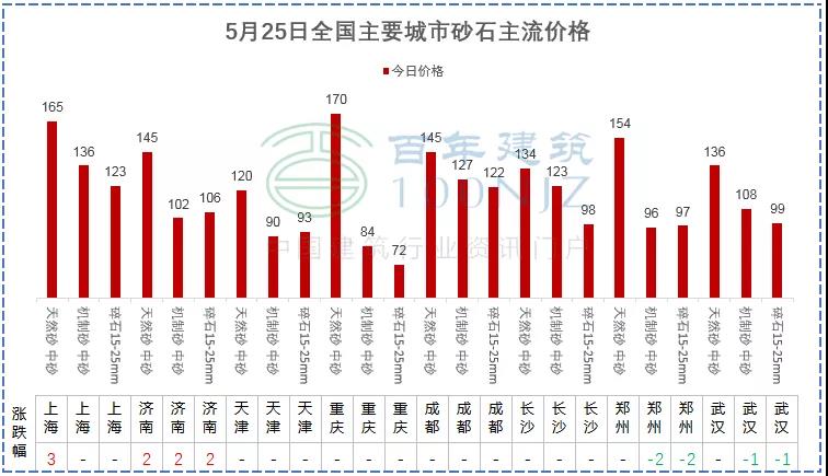 5月25日百年建筑網砂石均價114元/噸,日環比持平。全國重點城市主流規格砂石市場報價:上海天然砂165元/噸、機制砂136元/噸、碎石123元/噸;廣州天然砂177元/噸、機制砂137元/噸、碎石125元/噸;西安天然砂123元/噸、機制砂103元/噸、碎石101元/噸。