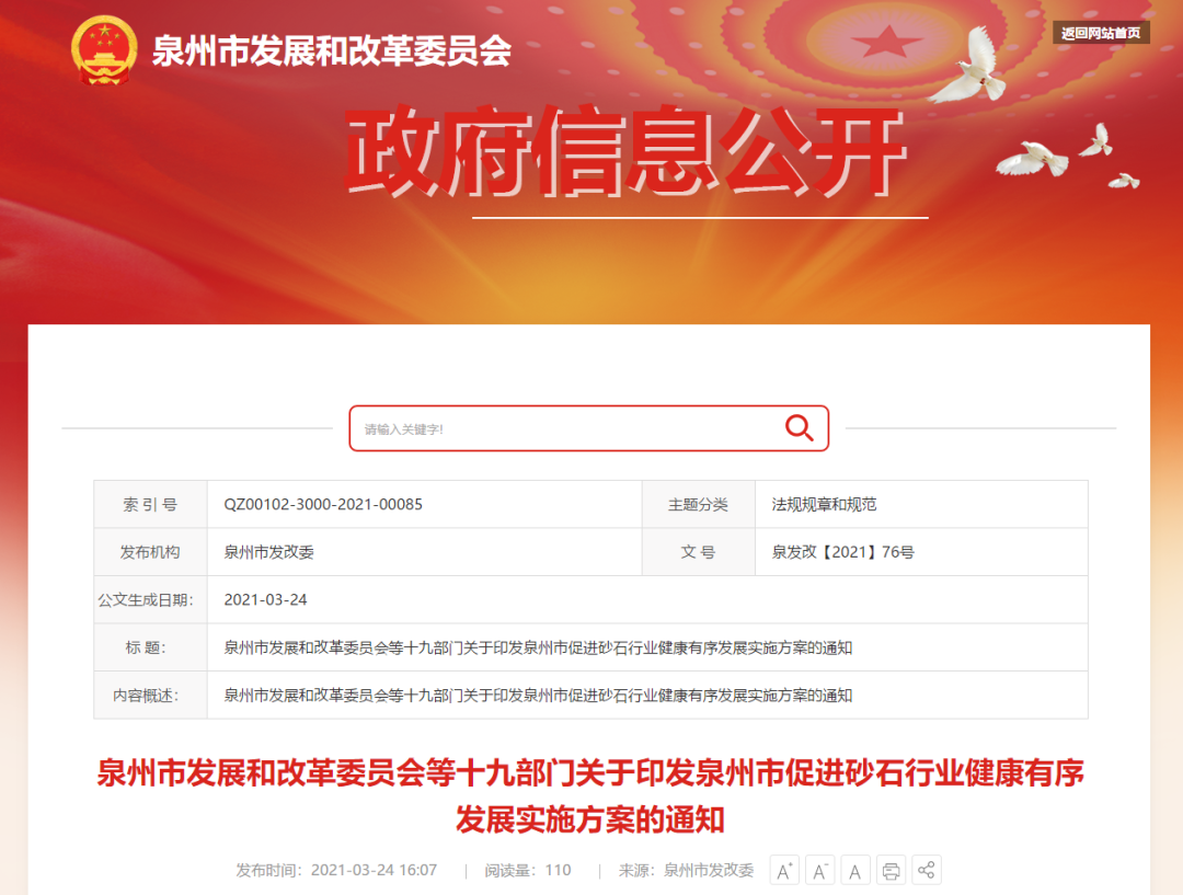砂石是工程建設中最基本且不可或缺的建筑材料。近日,福建省泉州市發改委等19個部門聯合印發《泉州市促進砂石行業健康有序發展實施方案》(以下簡稱《實施方案》),將綜合施策、多措并舉,進一步優化我市砂石產銷布局,穩定砂石供應,保持價格總體平穩。