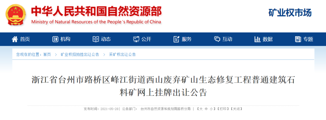 本公告在臺州市自然資源和規劃局路橋分局門戶網站、浙江省礦業權網上交易系統交易大廳同時發布。