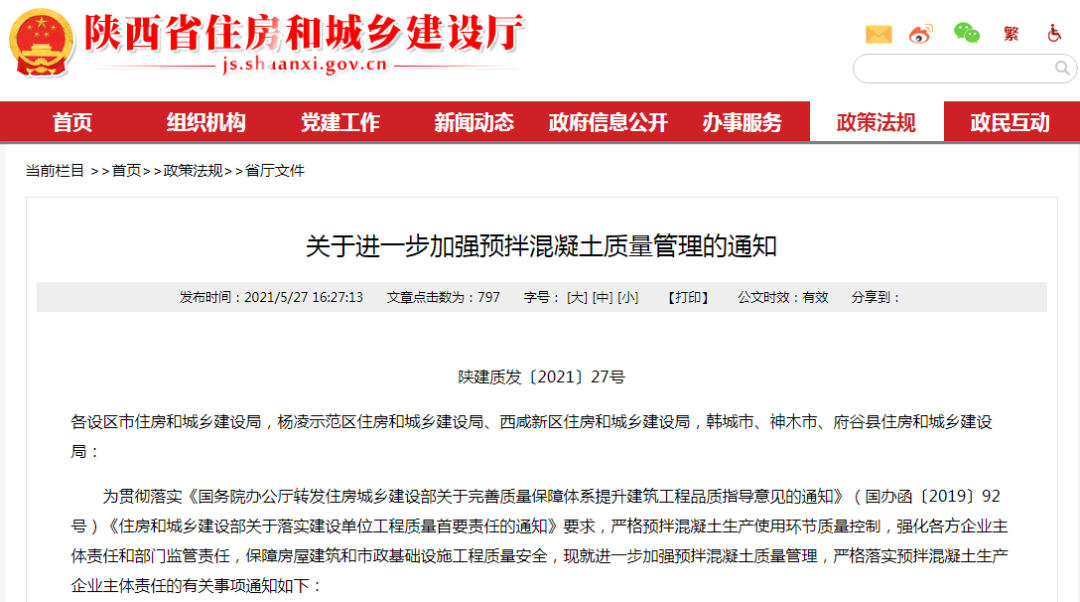 據悉,近日陜西省住房和城鄉建設廳發布《關于進一步加強預拌混凝土質量管理的通知》,(以下簡稱《通知》)。