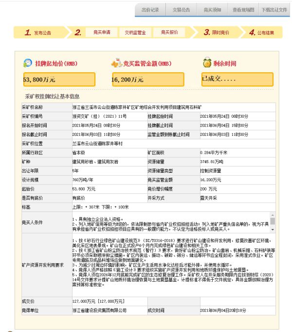 6月7日,浙江省建設投資集團有限公司以12.7億的價格競得浙江省蘭溪市云山街道陳家井礦區礦地綜合開發利用項目建筑用石料礦采礦權。