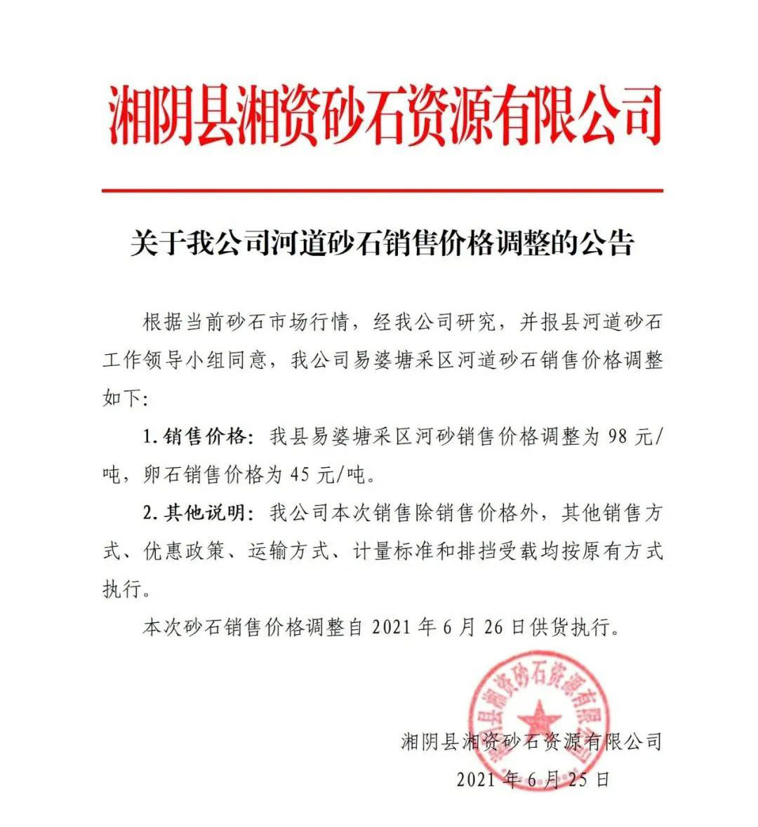 本次砂石銷售價格調整自2021年6月26日供貨執行。