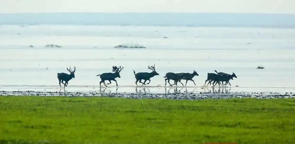 洞庭湖邊奔跑的野生麋鹿。楊一九/攝
