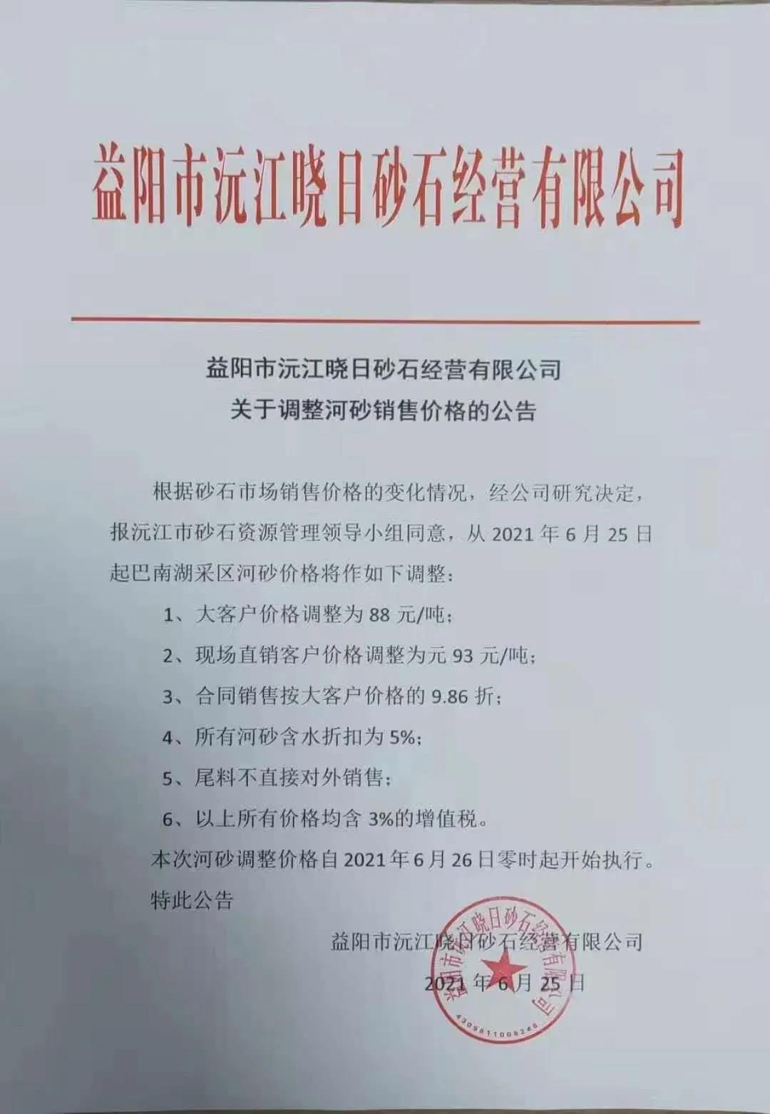 近日,益陽市沅江曉日砂石經營有限公司發布了關于調整河砂銷售價格的公告。