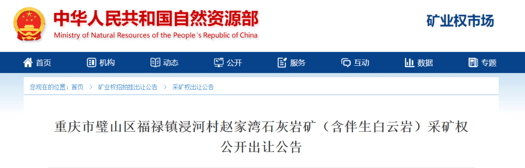 重慶市璧山區福祿鎮浸河村趙家灣石灰巖礦(含伴生白云巖)采礦權公開出讓公告(渝礦采出字〔2021〕(璧山)4號)
