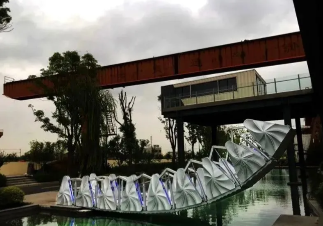 項(xiàng)目位于上海張廟街道轄區(qū)北部、沿蕰藻浜岸線(xiàn)的交運(yùn)老碼頭——一號(hào)創(chuàng)新帶交運(yùn)智慧灣科創(chuàng)園,3D打印的景觀(guān)伸縮橋作為連接沿河步行道與高線(xiàn)廊道,是跨越園內(nèi)湖的必經(jīng)之路。