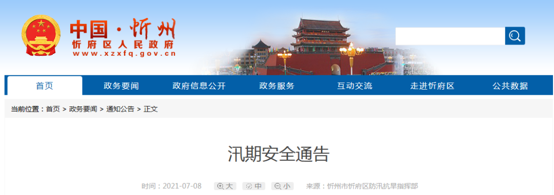 目前,忻州市忻府區已全面進入主汛期,為進一步增強社會各界、有關部門和全區人民群眾防汛減災意識,提高避險自救、互救能力,避免出現人員傷亡和財產損失,現將有關事項通告如下: