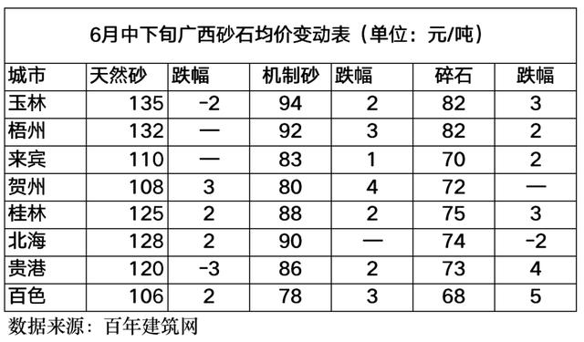 表1:6月中下旬廣西砂石均價變動表(6.15-6.30)