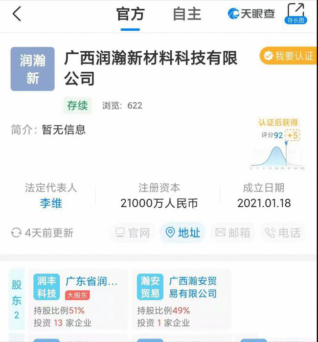 值得注意的是廣西潤瀚新材料科技有限公司由由廣東省潤豐科技投資有限公司與廣西瀚安貿易有限公司共同出資成立,前者是華潤水泥的下屬公司。