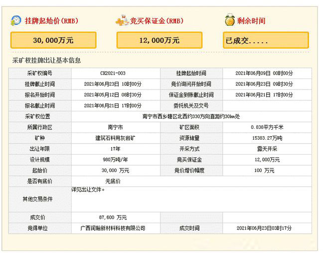 創廣西新高!南寧一建筑石料用灰巖礦以8.76億元高價成功出讓