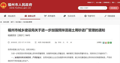 日前,福州市發布《福州市城鄉建設局關于進一步加強預拌混凝土用砂進廠管理的通知》(以下簡稱《通知》),進一步規范福州市預拌混凝土原材料質量管理,加強預拌混凝土質量監控,確保建筑工程結構質量和安全。