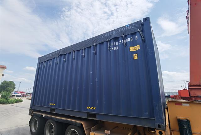 敞頂集裝箱帶有篷布,可隨時開合方便裝運貨物/記者拍攝