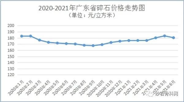 2021年上半年各區域碎石價格緩慢上升,均價略高于去年同期水平,全省平均購進價為(每立方米,下同)178元,環比上升4.82%,同比上升1.55%。其中,粵東、粵北、粵西和珠三角地區碎石購進價分別為197元、144元、136元和200元,環比分別上升4.65%、5.89%、4.72%和4.41%,同比分別上升0.84%、7.5%、1.94%和1.6%。2021年上半年機制砂購進價為162元,環比上升5.89%,同比上升4.48%。