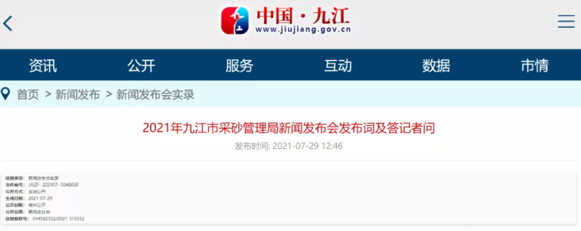 采砂管理局舉辦2021年九江市采砂管理局新聞發布會。九江市采砂管理局黨組成員、副局長寧革介紹九江市采砂統一管理相關情況,并答記者問。